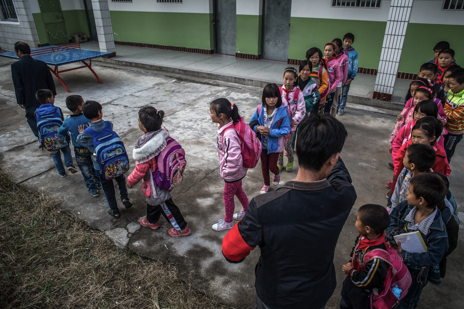 中午放学时,全校27名学生在教室前的操场上排队,清点人数。当天是二年级的语文老师周桂旺值班,他戴上红袖章把学生带到校门口等家长接走。“近年来,不少家长看到一个湾子里的另一家孩子去了条件更好的学校,也会产生带孩子去外地读书的想法。”周桂旺老师说。